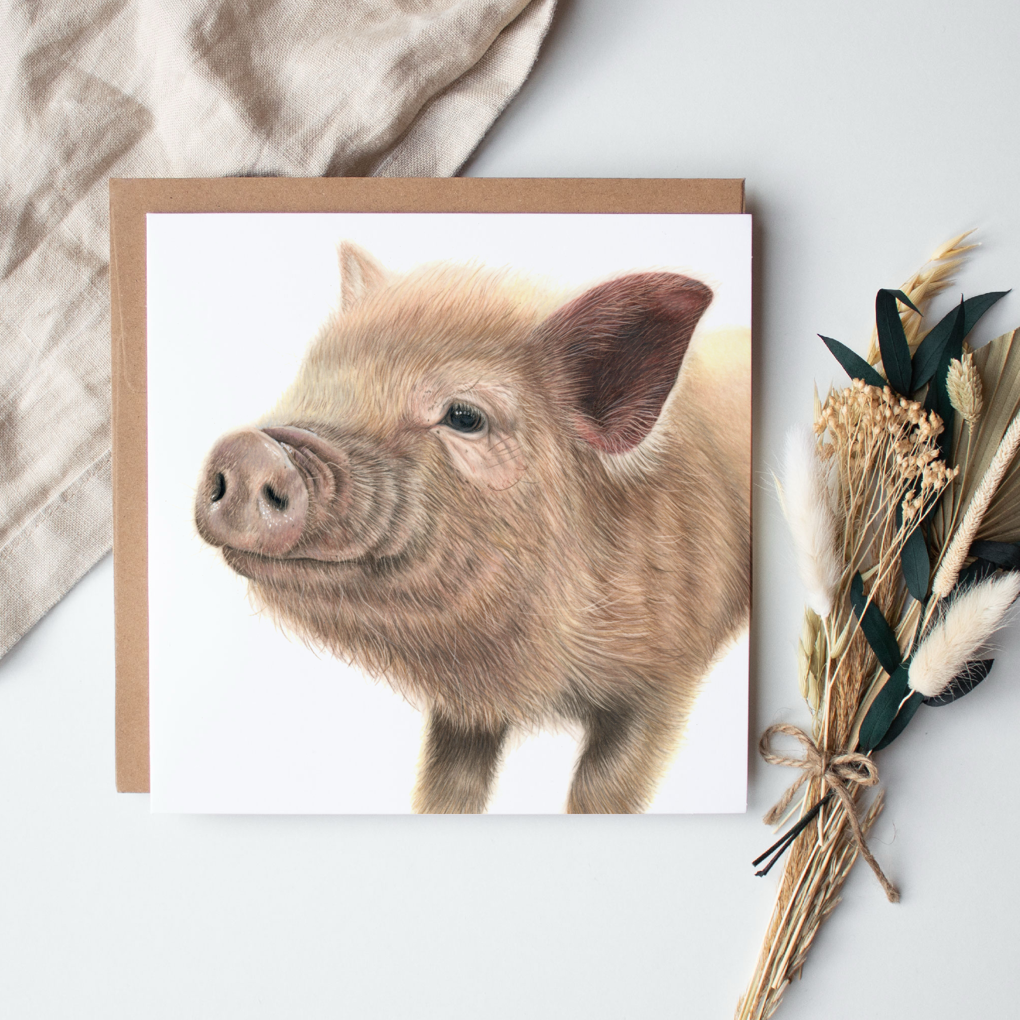 En liten gris med stora, nyfikna ögon och ett oemotståndligt rosa tryne. Ett motiv som får alla att le!